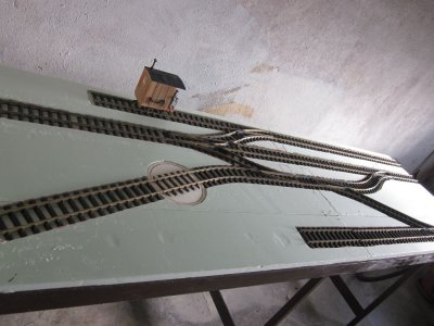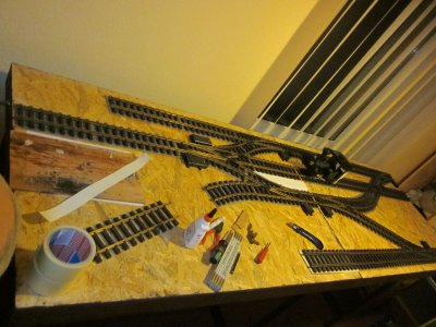 2 Segmente der Anlage mit dem endgültigen Gleisplan, links mittig ist das Ausfahrtgleis für die fertigen Holzprodukte dahinter kommt ein Wasserturm hin, davor die angedachte Drehscheibe mit Unterstand für die Lok, rechts oben ist die Ausfahrt Richtung Wald, mittig der Holzlagerplatz, dahinter kommt dann das Sägewerk, rechts vorn das Ladegleis für Bretter und Balken.