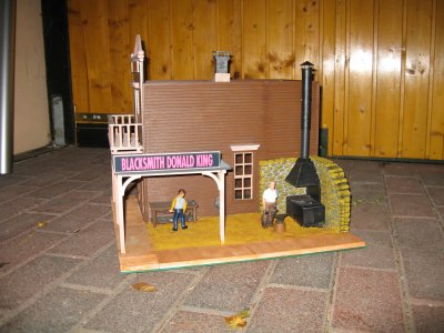 Aus dem Bausatz Blacksmith leicht geändert enstand eine Schmiede.Das Gebäude wieder auf eine Grundplatte geschraubt und mit Gehsteigen aus PVC Holznachbildung versehen.So enstand eine Art Innenhof.
