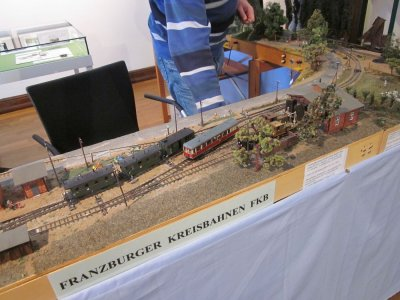 Triebwagen der FKB trifft im Bhf ein, vorm Lokschuppen 2 Messingmodelle