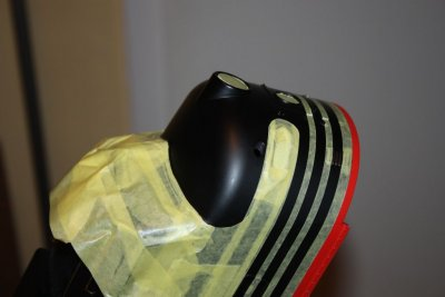 Hier die fertig abgeklebte Nase, der obere Teil der Schürze ist schon lackiert.Alle benutzten Farben sind Lösemittehaltig und von Revell. Die Farbe wurde mit einer Airbrushpistole aufgetragen.