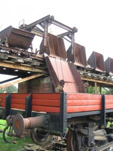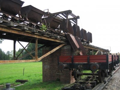 hier gut zu sehen , die Kipploren der Feldbahn mit dem Schüttblech und dem Regelspurwagen