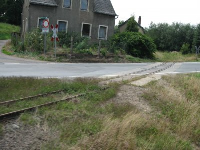Abzweig nach Kemlitz, über die Strasse hinweg liegen die Gleise noch