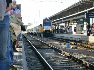 Auch ein ODEG-Kiss-Triebwagen war da. Die Menschenmassen warteten aber auf den Dampfer