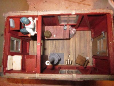 Bretterverkleidung fertig Fenster probehalber, Dach oben bleibt für die Innenarbeiten noch offen, Caboose in drei Teilen, Untergestell, Bretterrahmen und Dach