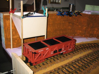die Gleislage steht,für den Landschaftsteil wird das Eckmodul hinzugezogen,für den gleistechnischen Teil wird ein weiteres Modul benötigt um die erforderliche Länge des Beladungsgleises realisieren zu können