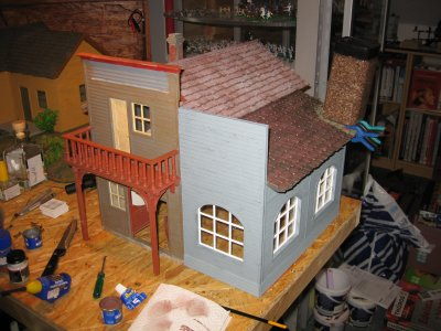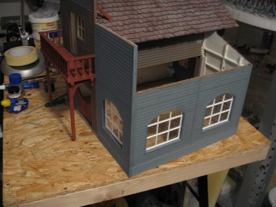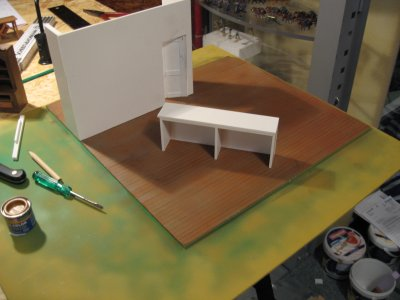für den Ausseneinsatz wird das Gebäude mit einer Grundplatte aus geschäumten Hart-PVC versehen.Das Material ist preiswert und läßt sich gut verarbeiten.Auf die Grundplatte (grün) wird die Gebäudeinnenplatte geklebt (gleiches Material) das versteift die Grundplatte zusätzlich und fixiert das Gebäude.