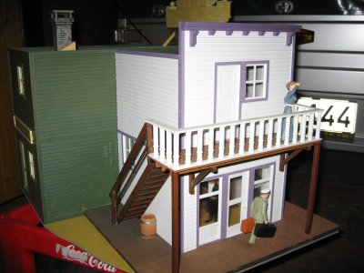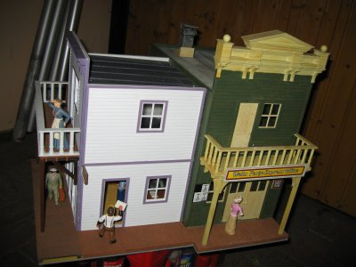 aus den Bausätzen Wells Fargo und National Bank von Pola enstand ein kleiner Häuserkomplex.Beide Gebäude ruhen auf einer Grundplatte.Der Bausatz National Bank wurde um den Aufgang und die Galerie ergänzt.Hier gut zu sehen.