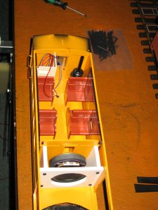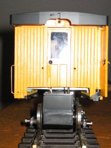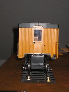 anschließend wird die Trägerplatte in den Wagenkasten eingebaut, zuvor mußte aber noch die richtige Einbauhöhe ermittelt werden.Dazu wurde der Wagenkasten mit dem zweiten Drehgestell zusammen gebaut und alles anschließend in Waage gebracht.