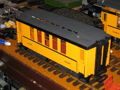 und farblich behandelt, es fehlen nur noch die Oberlichtfenstereinsetze und die Rauchabzüge der Ofenheizung.Natürlich wird der Wagen noch mit Zugschlußbeleuchtung ausgerüstet.
