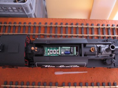 zwischen den Satteltanks befindet sich die Elektronik der Maschine und ist von aussen erreichbar.Dazu braucht nur die Mittelplatte mit den Domen abgenommen werden.Oben erkennbar der neue Decoder von QSI ,Motor und Sound-Decoder in einem.Der Anschaffungpreis bewegt sich in der oberen Kategorie.Da ich den Verkabelungsaufwand scheute musste ich tief in die Tasche greifen.