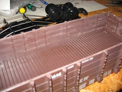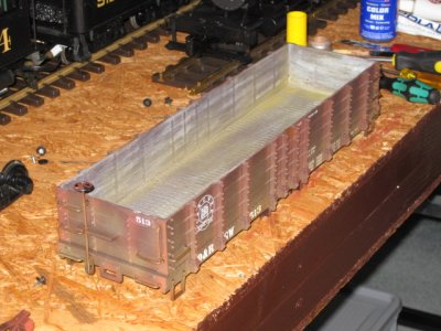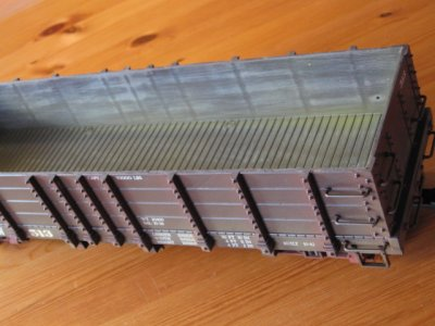 das innere des Wagenkasten erhält nun eine angedeutete Bretterstruktur, dies erreicht man mittels einer Feile. Diese wird senkrecht zum Wagenkasten hin und her bewegt, also keine Feilbewegung im herkömmlichen Sinne.