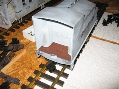 die Bretterseitenwände sind mittels stark verdünnter Revellfarbe mit Pinsel wischend gealtert worden. Der Rest wurde mit Airbrush und Ocker bzw. Brauntönen behandelt.