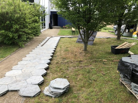 der Aufbau beginnt , dieses Jahr mit Platten von der Messe um die Bodenunebenheiten auszugleichen