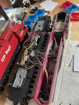Motor und Gleisanschlüsse sind verdrahtet , der Lautsprecher-Anschluß mit Stecker vorbereitet